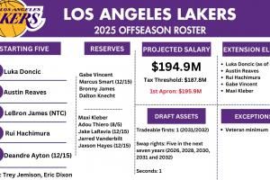 其中,湖人可交易的选秀资产仅有1个首轮(2031年或者2032年)以及1个次轮,湖人还有5个选秀权互换(2026、2028、2030、2031以及2032年)。