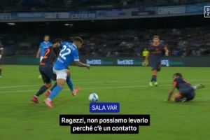 VAR: "确实,迪洛伦佐有介入,但他介入是因为一个动作……他并不是为了争取不属于球的空间而伸腿,而是为了保护球而伸腿。我们来看一下姆希塔良的动作,稍等。看看迪洛伦佐的脸,他正保护着球。稍等一下,我在核实。”