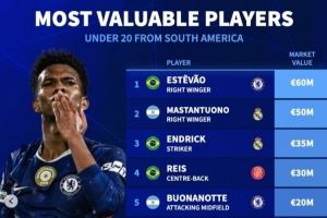 南美U20身价榜:埃斯特旺6千万,恩德里克、罗克、埃切维里在列