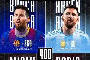 里程碑!梅西生涯400助分布:巴萨269+阿根廷60+迈阿密37+巴黎34