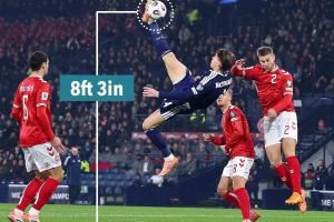 惊天倒钩!麦克托米奈倒钩高度2.53米,比当年C罗还高了15厘米