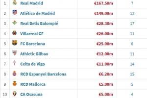 皇马、马竞之后,排名第三的贝蒂斯目前只花费了2830万欧,第四的比利亚雷亚尔花费2600万欧。巴萨2500万欧暂排第五,引进了胡安-加西亚和拉什福德。