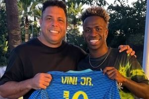 作为两代巴西球员中的领军人物,两人也都显得非常开心,并且共同手持着维尼修斯在巴西国家队的10号球衣。